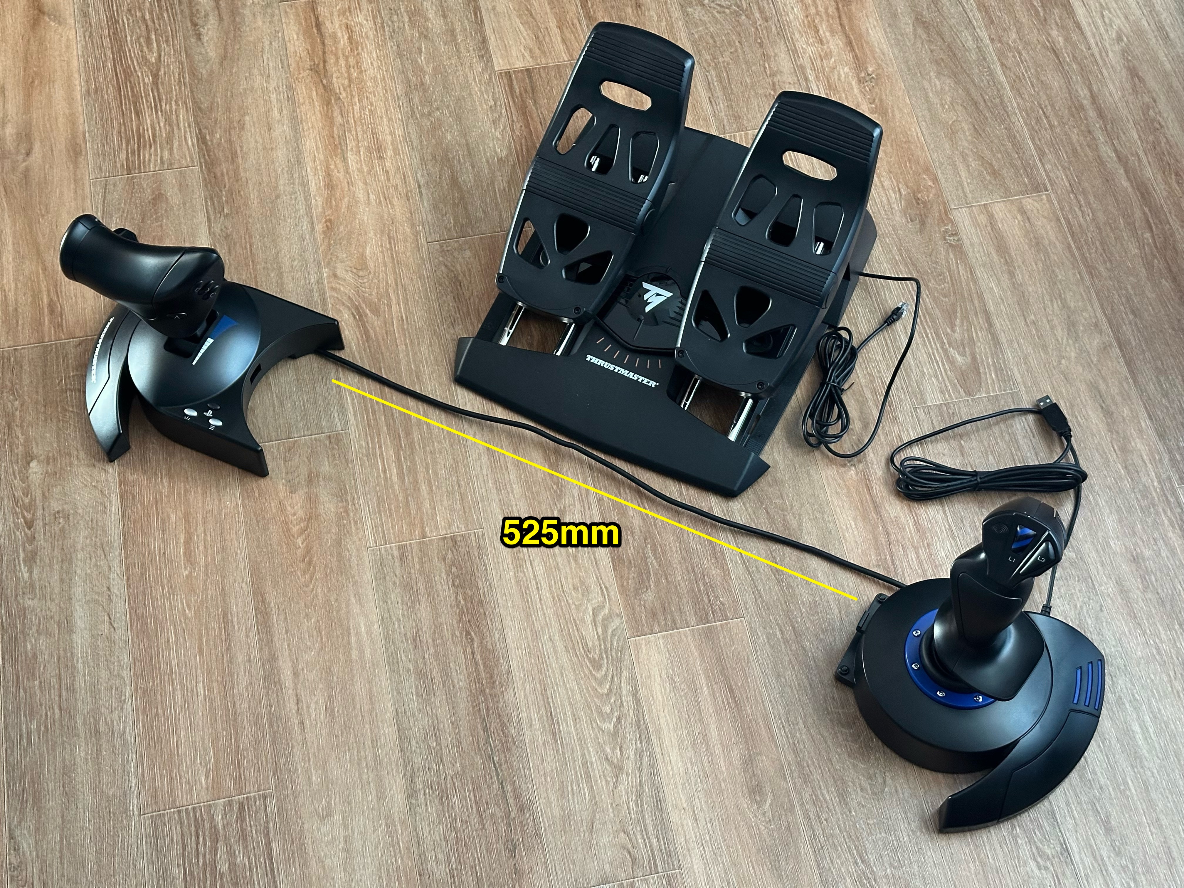 스틱과 쓰로틀의 연결 케이블을 길게 펼쳐보니 52.5cm 정도의 길이입니다. (의자 좌우에 놓기엔 조금 아슬아슬 한 길이입니다.)